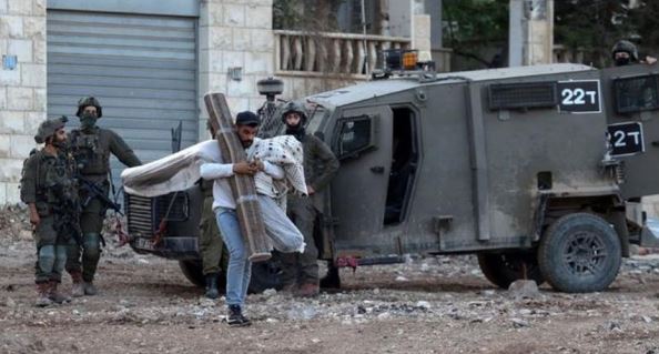 A Palestinian man carries his belongings as he evacuates his home during an Israeli army raid on the outskirts of the Jenin refugee camp in the occupied West Bank.
